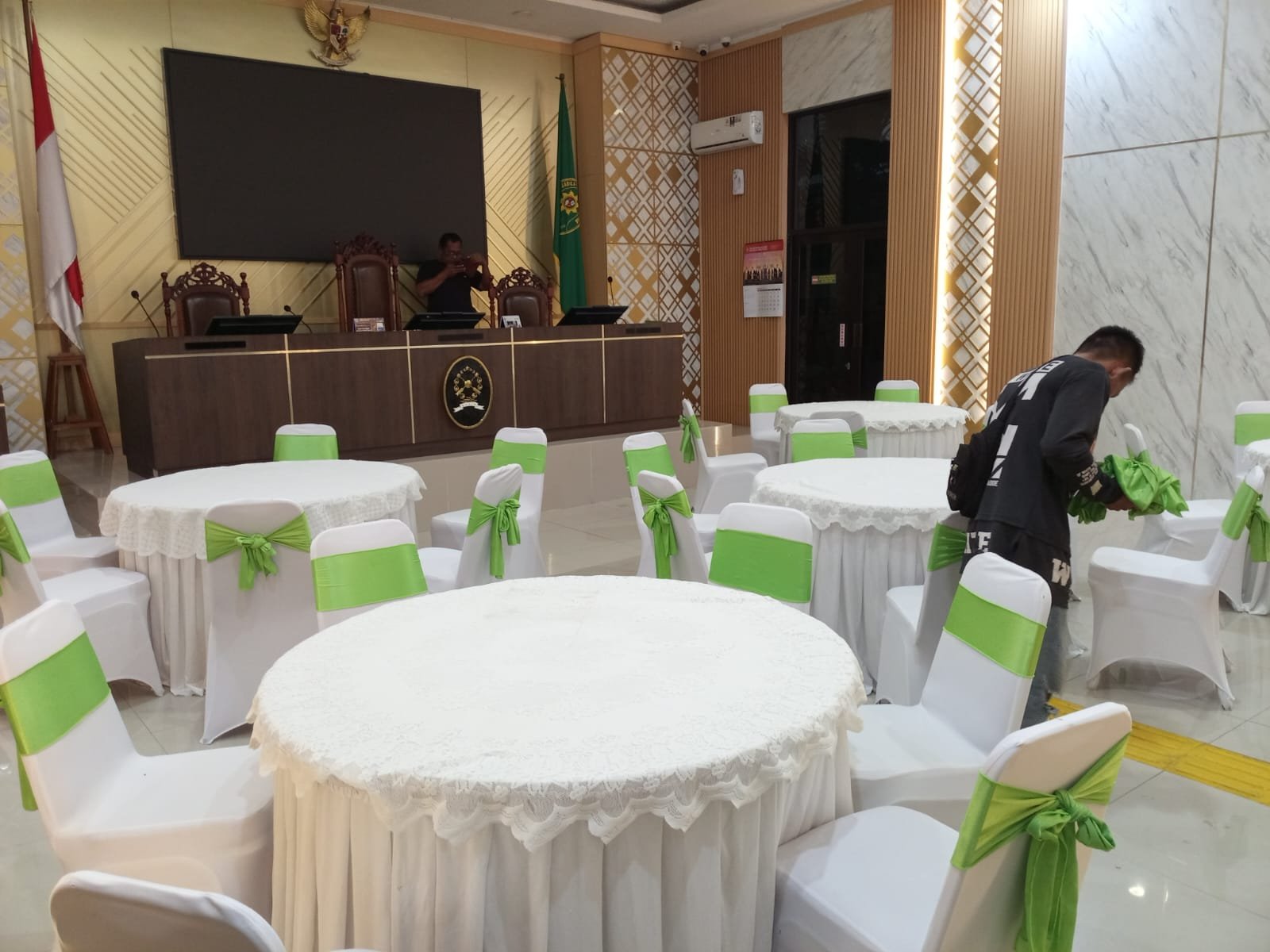 Kursi berjok empuk berlapis kain putih berpita, memadukan kenyamanan dan keindahan sekaligus.